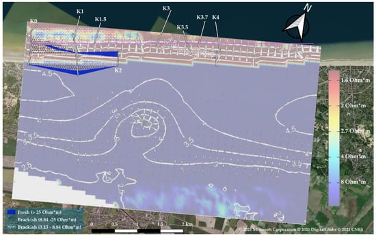 to convert the bulk resistivity () to the pore water resistivity (). A formation factor (F) was estimated for both zones, which was 3.2 for De Westhoek [39] and 4 at Sint-André [8]. We distinguish between fresh- (higher than 20 or 25 Ωm respectively), brackish, and salt water (below 2.5 or 3.125 Ωm respectively).