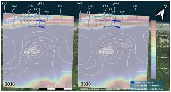 The depth of the saltwater lens will increase, according to Lebbe [8], in the coming years due to the re-licensing, in which more pumping will occur (up to over 25 m in 2040). At K8.4 and around K7.8, the groundwater models show a saltwater lens that is approximately 16 and 23 m thick in 2016 and 2030, respectively [8]. A lens of approximately 10 m thickness is seen in the inversion models, which is thinner than in both scenarios of the hydrogeological model. The saltwater lens extent seems to be overestimated in the groundwater model in the lateral and vertical directions, which is likely due to the dimensions of the model cells (75 m × 75 m × 2.5 m).