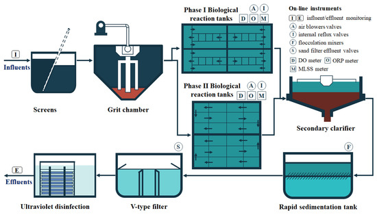Schematic representation of treatment processes and on-line instruments in the selected WWTP.