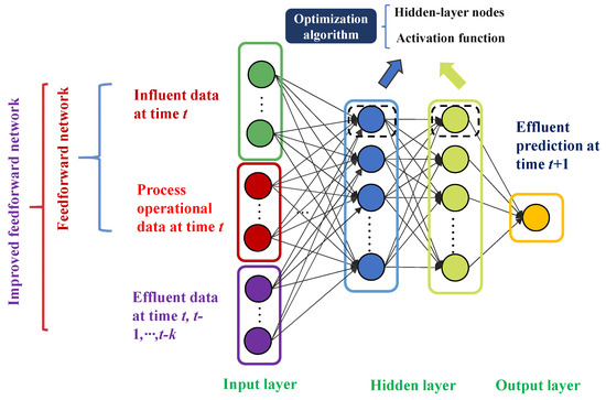 Equation (4) indicates that effluent water quality at a future time is related to both the influent mass loading and effluent water quality at the present time. Based on traditional FFNN design, the influent mass loading and treatment process parameters (generalized as ) are treated as the input layer and effluent water quality is regarded as the output layer. However, the influence of current and historical effluent water quality on future water quality cannot be incorporated into the FFNN. To overcome this problem, we designed an improved feed-forward neural network (IFFNN) that further introduced historical WWTP effluent parameters into ANN input variables, as shown in Figure 2. In this way, the multi-layer perceptron ANN enabled the model to capture the memory of the WWTP operation for future directions in real-time prediction, and it would be efficient to model highly dynamic systems with time series [45]. Depending on the data collection frequency of on-line sensors (1 h data sampling frequency in this case), the model could perform the prediction in a flexible way. Compared to the recurrent neural network model featuring a recurrent hidden state whose activation at each time is dependent on that of the previous time [46,47], the IFFNN developed herein permits the detection of temporal dependences more easily by directly incorporating the previous on-line effluent measurements as inputs.