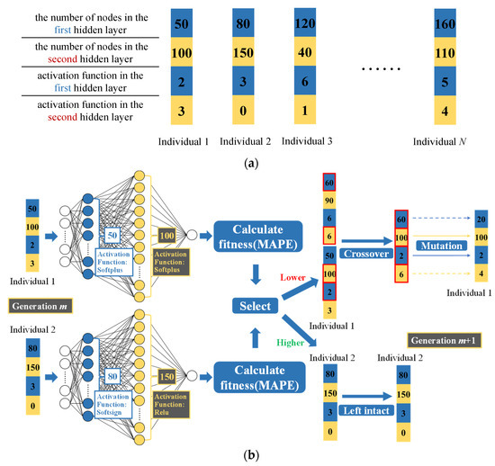 Step 1: Generation of the initial population. Figure 3a gives an initial population with N designated individuals or chromosomes, and each individual is a combination of four optimization parameters, including the number of nodes in the first hidden layer, the number of nodes in the second hidden layer and the activation function in each of the two hidden layers, respectively. For the activation function in the first and second layer of each individual, the numbers 0~6 represent the Relu, Softmax, Softplus, Softsign, Relu6, Tanh and Sigmoid functions, respectively.