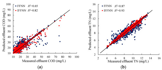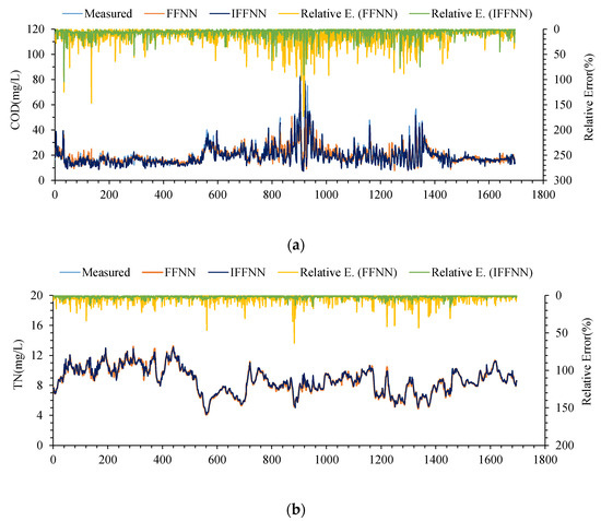 Comparison of real-time modeling performance based on FFNN and IFFNN is demonstrated and summarized in Figure 4 and Figure 5 and Table 2. Generally, the lower relative error and higher R2 throughout the data groups, and for the two modeled parameters of COD and TN, are indications of the IFFNN’s robustness. Strictly, if taking test datasets as the measurement, the MAPE of the FFNN approximating wastewater treatment processes was 22.0% and 8.4% for effluent COD and TN, respectively, while the MAPE of the predicted COD and TN using the IFFNN was 16.,8% and 4.8% respectively. The performance efficiency of IFFNN modeling improved by 23.6% and 42.9% for COD and TN, respectively, as compared to that of the basic FFNN. If the test datasets were compared based on R2, it increased from 0.20 to 0.47 for effluent COD after the employment of IFFNN. For effluent TN, R2 improved from 0.70 to 0.89 after the use of IFFNN.