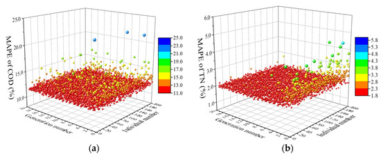 Furthermore, the modeling prediction efficiency with the increase of artificial neurons in the hidden layers and backward hours for effluent data input was probed, so as to further test the robustness of the optimized IFFNN model. The activation function in the first and second layer remained the same as that of GA-IFFNN in Table 2. The artificial neurons in the hidden layers ranged from 200 to 800, and the backward hours for effluent data input ranged from 1 to 25 h (i.e., at moments t, t − 1, …, t − 24 in Equation (5)). The MAPE and R2 of the test datasets for predicted COD and TN under different neural network complexity are presented in Figure 7 and Figure 8, respectively. These two figures exhibit a fluctuating trend of modeling performance, which is associated with the high non-linearity of the ANN structure.