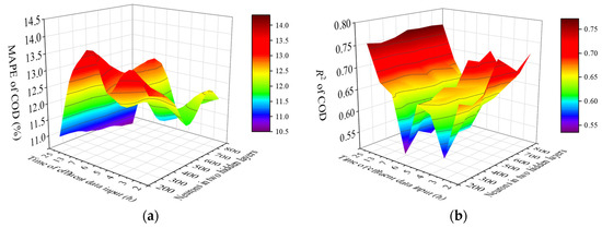 Change of IFFNN performance for COD with artificial neurons in the two hidden layers and time period of historical effluent data input: (a) MAPE and (b) R2 of test datasets.