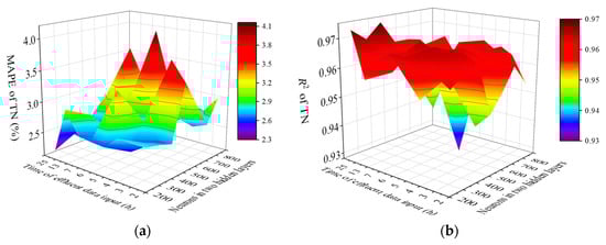 Change of IFFNN performance for TN with artificial neurons in the two hidden layers and time period of historical effluent data input: (a) MAPE and (b) R2 of test datasets.