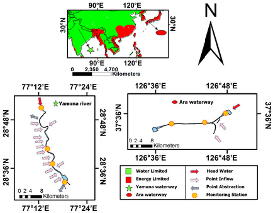 The study was conducted over energy limited and water limited regions on the basis of the global climatological aridity index (GCAI). Regions were separated using global data assimilation system (GLDAS) datasets conferring to the concept of a framework known as Budyko [34,35]. The GCAI is a numerical indicator of the degree of dryness or wetness (GCAI = PTm/Pm, where PTm = mean annual potential evapotranspiration and Pm = mean annual precipitation). The regions having an index value GCAI < 1.5 were classified as “energy limited”, and those with GCAI > 1.5 as “water limited” [36]. Two Waterways were selected, one from the energy limited regions: Gyeongin Ara Waterway also known as Ara Canal, South Korea, and the other from the water limited region: Yamuna River, India. Figure 1 shows a description of the study area, Waterways, and point source locations.