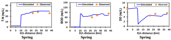 The surface water quality model WASP8 was primarily calibrated through the measured data attained from the four sampling locations (M1–M4) along the longitudinal stream of the Yamuna river and three sampling stations of the Ara Canal (m1–m3) Waterway on March, 2014 (spring) using the same measured coefficients (Figure 3 and Figure 4). Then, the data collected from June (summer), September (autumn) and December (winter) were used to validate the model also by means of the same estimated reaction constants and model coefficients (Figure 5 and Figure 6). Calibrated and validated results of the longitudinal pro-file of T-N, BOD, and DO, agreeing well with the measured values at monitoring stations and both measured and simulated, had the analogous trend of variations. The Ara Waterway shows comparatively large seasonal variation, which might be due to higher mean annual rainfall in the wetter region [42].