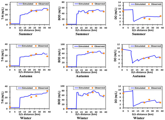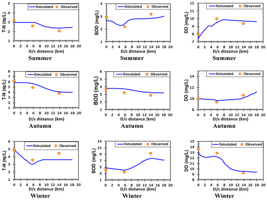 The mean absolute percentage error (MAPE) evaluation shows that the values were enclosed among 3.5–22.61% (excellent–reasonable) (Table 1). The mean absolute error (MAE) shows overall estimator errors are less and agreed well with the measured data both in model calibration and validation processes (Table 2). The values of coefficient of determination R2 had good agreement with measured data and appeared to be very close to 1 (Table 3). Moreover, all applied statistical estimators show high value of R2 (close to 1) and lower values of errors of estimators. Overall, longitudinal profile of Yamuna Waterway shows small seasonal variation among water quality variables. At the headwater, water quality was comparatively better. However, after addition of point inflow through Najaf-garh drain water quality was further deteriorated. While, Ara Waterway showed large noticeable variation in water quality variables among each season. Total nitrogen shows a decreasing trend as it moves toward a downstream end in all seasons, while BOD and DO show further deterioration in water quality as they go toward a downstream end of the waterway profile in winter and summer seasons. In spring and autumn, BOD and DO both show improvement in water quality profile as higher rate fresh water point inflow is incorporated in waterways.