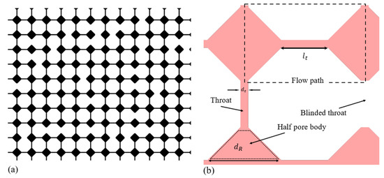 The geometry used in this article is quite similar to that was considered in our previous research work [34]. A regular two-dimensional pore network with a 30 × 30 size was generated. Consider a periodic array of regular octagons, as shown in Figure 1a. The space between these octagons is the void space for fluid flow. The characteristic dimensions (, and ) of pore and throat are shown in Figure 1b. As this figure shows, the expansions and contractions at the throat entry equal half of the pore sizes. A flow path (FP) was formed by a throat and two adjacent pore bodies. The solid phase is shown in white, and the void phase is colored.