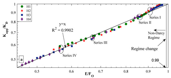 Figure 2a is sketched according to Equation (8) and shows that the extracted permeability data reasonably obey the Forchheimer equation and are consistent. Table 2 reports the parameters for Darcy and Forchheimer’s equations.