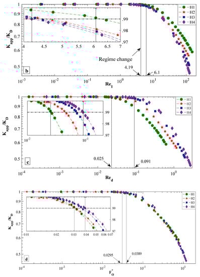 Figure 4c shows that the larger is, the sooner the quadratic equation in the pores fails, in agreement with Figure 2e. At this criterion, a jet flow would leave a throat without influencing by the pore’s wall. The quadratic equation stems from viscous forces, which are influenced by the wall’s friction. Larger pores do not meet these criteria at elevated velocities.