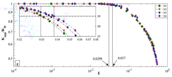 Figure 3b depicts as a function of . As it is seen, for sufficiently small velocities, . However, it increases as E increases and becomes a function of U (). The cessation of Hagen–Poiseuille approximation () as the point where is indicated. Notably, is considerably greater than , which asserts that the cessation of Hagen–Poiseuille equation in throats does not provoke the non-Darcian flow. Moreover, the larger the , the more rapidly the Hagen–Poiseuille equation fails (with respect to ).