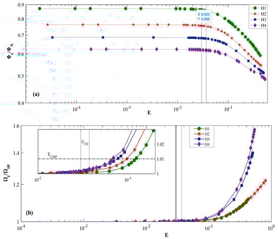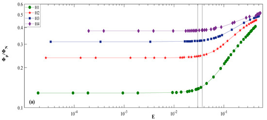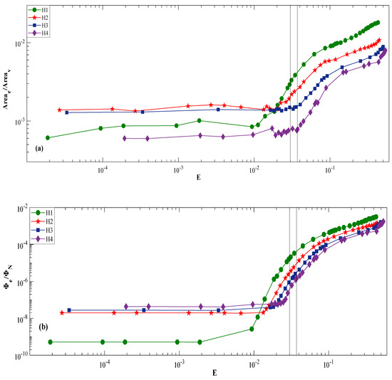 According to Table 1, decreases as the throats become wider, showing an equal weight of pores and throats. Figure 4a,b support this thought. Furthermore, the fraction of pore dissipation increases in the Forchheimer regime with E, in agreement with Figure 3a.