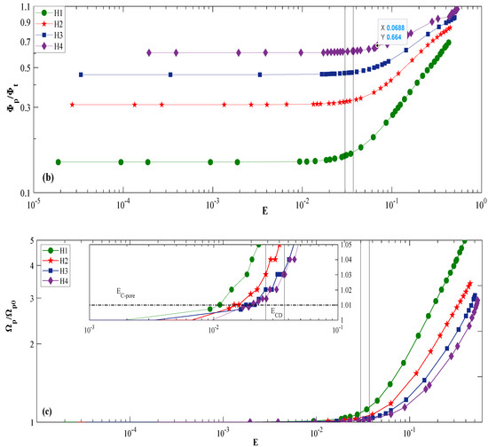 By analogy to throats, it is assumed that simulates pore dissipation in Darcy regime, where is a function of fluid velocity and pore geometry. Defining as the value of at infinitesimal velocity, the as the termination of applicability of quadratic equation in pores (). Above this criterion, the viscous interactions are controlling. Below that, inertial forces become significant. Figure 4c represents the variation of as a function of E. At low E, equals 1. However, increasing the velocity increases severely. Compared with Figure 3b, departure of is more observable at high velocities. Moreover, it is evident that for all networks, in contrast to .