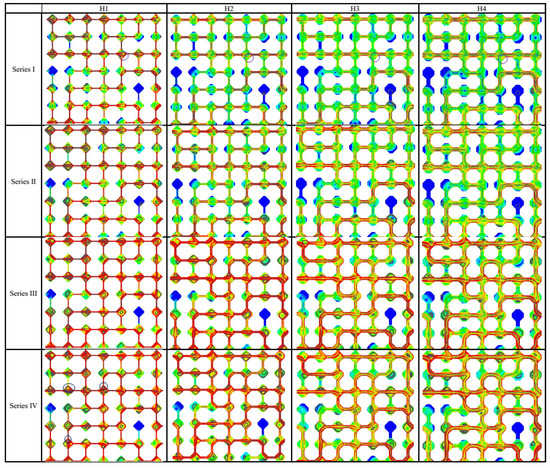 The dimensional analysis extracts two non-dimensional morphological parameters, i.e., and . Table 1 summarizes the morphologies used to investigate the effect of different variables. It should be noted that all networks have the same topology. This means that the same throats are blocked in all networks so that the local heterogeneity is the same. Remarkably, are greater than the flow paths.