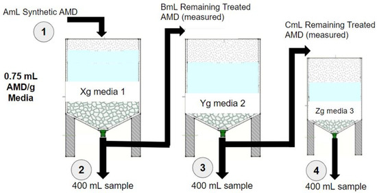 Successive process trains were evaluated in a laboratory-scale set-up, and a full factorial analysis was performed. A schematic diagram of the experimental set-up is shown in Figure 1. Three polyester reactors were used and contained the corresponding media for each process train; the first two were big reactors, while the third was a smaller reactor. There were four sampling points, as shown in the diagram. The first sampling point correspondd to raw synthetic AMD, while the other sampling points collected (400 mL each) the treated AMD after each media in the process train. A 15-min retention time was employed for each reactor before the sample collection; then, the transferring of the treated AMD solution to the next reactor to be treated by the next media was performed. It must be noted that the media was not transferred to the next reactor; thus, no layering occurred in the experiment. Based on a study, it was found that the retention time varied between 1–60 min and did not have many significant effects on the results [40]. However, based on the graphs presented, the 15-min retention time showed the optimized performance for the overall parameters. The volume of the remaining treated AMD from the previous reactor was measured before each transfer to the next reactor to ensure that the 0.75 g/mL media-to-AMD ratio was retained.