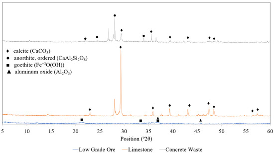 XRD patterns of concrete waste, limestone, and LMW.