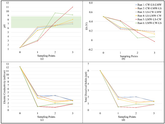 Change in (a) pH with Type C effluent standard highlighted in green [44,45], (b) Eh, (c) EC, and (d) TDS after each treatment media.