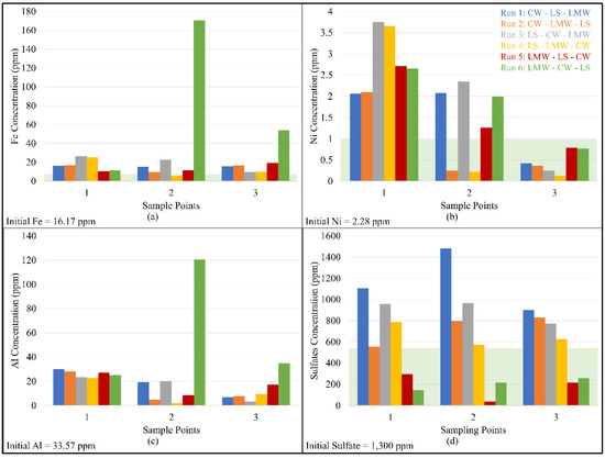 Change in (a) Fe, (b) Ni, (c) Al, and (d) sulfates concentration with Type C effluent standards highlighted in green [44,45].