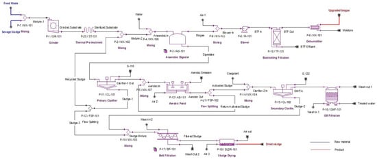 Primary and secondary clarifiers (CL-101 & CL-102) are used before and after the aerobic pond as a waste-activated sludge treatment and act as the holding tank. The sludge leaving from the bottom of the aerobic pond is recycled back to the aerobic pond feed inlet. The recycled sludge is known as return activated sludge (RAS) [38]. Coagulant is added into the secondary clarifier to improve the performance of suspended solid removal. To ensure the wastewater meets the discharge effluent standards (Standard A), the granular media (GM) filter (GMF-101) is used to reduce the BOD to <20 mg/L and COD < 120 mg/L [42]. The sludge that leaves from the bottom of CL-101 is sent to a splitter (FSP-101) where a portion of it is recycled back to the AD-101 inlet and the remainder is mixed with the CL-102 sludge, prior to being sent to the belt press filter (BF-101) for dewatering process. Finally, the dewatered sludge is sent for drying in the sludge dryer (SLDR-101) before being sold as fertilizer.