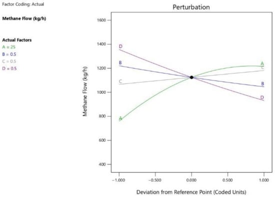 The perturbation plot shown in Figure 2 is used to monitor the change in the methane flow by changing one of the process parameters throughout its range whereas the other variables are kept constant. From Figure 2, it can be noticed that the change in HRT results in a larger deviation from the reference point compared to the other three ratios. This shows that HRT is the most sensitive parameter in methane flow response, a slight change in HRT results in large changes in the methane flow.