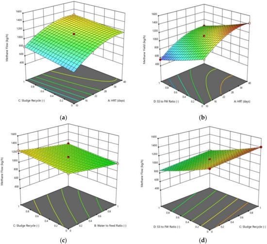Figure 3 show the 3D surface graph plot of the significant models with a p-value of less than 0.05 in the ANOVA analysis. As shown in Figure 3a, methane flow increases when the HRT and sludge recycle ratio increases. Maximum methane mass flowrate is achieved when the HRT is at 40 days and the sludge from primary clarifier is fully recycled back to the anaerobic digester. The HRT must be long enough to avoid the methanogens being washed out from the digester and causing the process failure [45]. Long HRT promotes higher microorganism activity and higher biogas yield but excess HRT could lead to ammonic nitrogen accumulation and inhibition to anaerobic digestion [46,47]. According to Tyagi et al. [22], the optimum HRT for mesophilic digestion is 10–40 days. Figure 3a plot shows that the methane flow increased linearly with the HRT, and indicates that the response is in line with the optimum range.