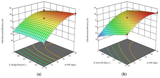 Figure 5 displays the 3D surface plot for the COD removal efficiency response surface. The model terms shown in Figure 5a–c give significant results in ANOVA analysis. Even though the model terms in Figure 5d are insignificant, however it is shown to give the effect of the addition of water in the ACD process to the COD removal efficiency. From Figure 5a, it can be noticed that COD removal efficiency increased along with the HRT at constant sludge recycle ratio. This is because as the HRT increases, the methane production increases, conversion of carbon element to biogas is higher therefore the COD removal efficiency is higher [51]. This can also be used to explain Figure 5b where the COD removal efficiency is maximum at zero SS to FW ratio. However, the COD removal efficiency decreases when the sludge recycle ratio increases and the methane flow increases. This is due to the fact that, as the sludge is recycled, the amount of organic matter that contributes to the COD value in the anaerobic digester inlet stream increases. Therefore, with the same amount of organic matter being degraded as compared to zero recycle, the COD removal efficiency decreases. It can be noticed that the 3D surface plot in Figure 5c is flat which indicates that these two process parameters have a minimal effect on COD removal efficiency. From Figure 5d, the COD removal efficiency increases when the water to feed ratio increases from 0 to 1. This is due to the fact that the addition of water causes the COD concentration in the feed to be reduced.