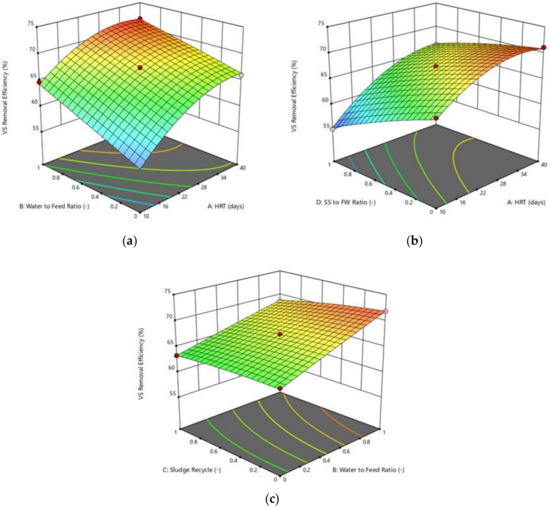 Three of the model terms’ 3D plots are shown in Figure 7 to discuss the effect and interactions of each process’ parameters on the VS removal efficiency. Based on the ANOVA analysis in Table 6, all the model terms which involved two independent variables are significant. The curvature of the plot shown in Figure 7a is the largest. This indicates that both the HRT and water to feed ratio has a linear relationship and have a significant impact on the removal of VS. Hence, the maximum VS removal efficiency of 72.5% can be achieved using the longest HRT (40 days) and highest amount of water (25,000 kg/h). Lower VS is present in the digester and is reported when the moisture content is high, due to the possibility of the washing out of organic solids when water is added into the anaerobic digestion process [23]. The poorer VS present indicates a higher VS removal efficiency. Therefore, this explains the perturbation plot in Figure 6 which shows that the water to feed ratio has a significant effect on the VS removal rate. Furthermore, the VS concentration indicates the potential amount of biogas that can be produced from the substrates [51]. Hence, the longer the HRT, the higher the methane yield, the higher the VS removal efficiency. In Figure 7b, the VS removal efficiency decreases when the amount of SS increases. This is due to that fact that less biogas is produced when the amount of sewage sludge increases. Moreover, it can be seen from Figure 7c that the increase in the sludge recycle ratio only gives a very little increment in VS removal efficiency. This is owing to the little amount of VS remaining in the digested sludge and thus recycling the sludge only increases the small amount of VS in the digester. Therefore, the final and initial VS present in the substrate are almost the same. According to Lee et al. [53], the volatile solid removal efficiency for a bench scale ACD of FW and SS ranges between 46.6 and 61.7%. From the three figures above, it can be noticed that the VS removal efficiency rangesfrom 55% to 72.5%, regardless of how the parameters vary within their given range.