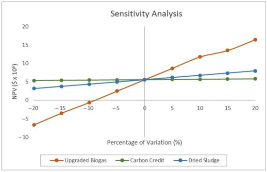 Sensitivity analysis is a method to determine the effects of uncertainties in the future on the viability of a project [64]. This analysis is performed by varying each of the parameters individually and the output is the parameter which has the most direct effect on the project viability, such as NPV. In this section, the unit price for the products (upgraded biogas, dried sludge and carbon credit) are varied with a range of ±20% of base cost while the capital cost is kept constant to determine the effect on NPV [64].