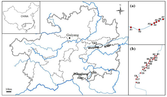 Sampling sites (red circles) along the Wuyang (a) and Zhangjiang (b) rivers in southwestern China. Sites A1 to A7 represent a developed inland waterway in the Wuyang river; sites B1 to B9 represent a stretch of inland waterway under construction along the Zhangjiang river; and sites C1 to C8 represent an undisturbed stretch of the Zhangjiang river.