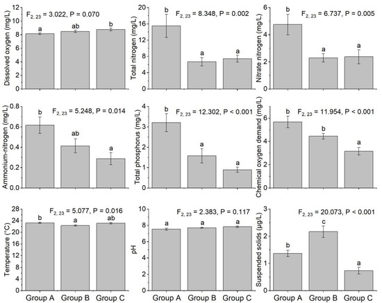 The differences in water quality variables among the three groups. Data are expressed as the mean ± SE and letters indicate significant differences based on post hoc tests.