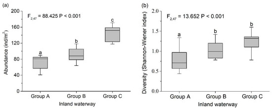 We identified 26 macroinvertebrate taxa, the most dominant among them being Oligochaeta, represented by two taxa; Gastropoda, represented by eight taxa; and Chironomidae, represented by five taxa. Bivalvia, Insecta, Malacostraca, and Hirudinea also contributed several taxa each (Table 2). The abundance in the three river channels was significantly different (F2,47 = 88.425, p < 0.001). The highest macroinvertebrate abundance was observed in riparian habitats within the undeveloped stretch of the river (Figure 4a). The diversity of macroinvertebrate communities followed the same pattern as that of their abundance. The Shannon–Wiener diversity index within Group A was significantly lower than that in Groups B and C (F2,47 = 13.652, p < 0.001) (Figure 4b).