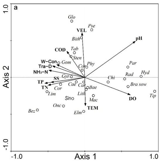 For an accurate interpretation of the relative importance of the building stage, traffic density, and water quality variables, variance partitioning was used to estimate the contribution of each variable group to the total variation in the benthic invertebrate assemblages [42,43,44]. Variance partitioning analysis determines the proportion of explained variation in the distribution of benthic macroinvertebrates for each environmental variable, interactions between two variables within a set of environmental variables, and interactions between all variables. During variance partitioning analyses, benthic macroinvertebrate abundances were natural-logarithm (ln)-transformed to guarantee the detection of any non-constant error variance. All statistical analyses were performed using Canoco statistical software ver. 4.5 [45], Origin ver. 9.0, and SPSS ver. 22.0.