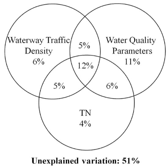 To determine the explanatory variance of benthic macroinvertebrate abundance, partial CCAs were conducted using reduced data sets. Single effects of water quality variables accounted for a large proportion of the variation but showed no significant difference between water quality and the density of shipping traffic. However, the effects of physical factors and the density were significantly different during the construction and operational phases. The shared variation among all three physical factors accounted for 12% of the variation (Figure 6), whereas 51% of the variation was unexplained. The taxa were clearly affected by water quality and by the phase of the waterway’s construction. Nearly half of the variation in abundance was probably due to unknown and undetectable variables, such as individual behavior and interactions among taxa.