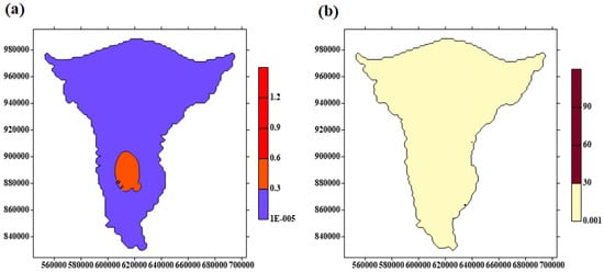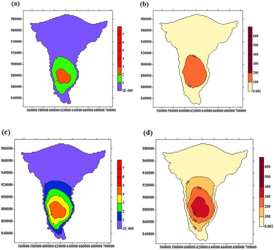 Numerous field experiments were conducted to estimate the aquifer parameters. Table 3 shows the initial values of hydraulic parameters in the MNDA area. Specific storage (Ss), specific yield (Sy), hydraulic conductivity (K), and effective porosity (neff) are all the hydraulic parameters for each layer of the study area. These data were collected from previous studies. The hydraulic conductivity was ranged from 0.1 to 0.25 m/d for clay cap and from 5 to 100 m/d for the other layers, and the storativity ranges from 10−4 to 10−3 [51].The model recharge from excess irrigation water and the GW extraction rate were based on the identified value by Morsy 2009 [36]. The recharge rate to the aquifer is 0.25 to 0.8 mm/day. The abstraction wells distribution in the MND is assigned according to data collected by RIGW [35,36]. Figure 4b presents the distribution of 946 abstraction wells assigned to the study area. Production irrigation water wells and drinking water wells are among the groundwater abstraction activities in the Nile Delta aquifer. The abstraction from wells produced a total volume rate of 2.22 × 106 m3/day. As shown in Figure 4b, there are few abstraction wells in the northern part of the MND to avoid saltwater intrusion due to over-pumping because the northern part is near to the Mediterranean Sea.