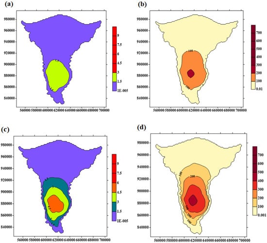 Population growth leads to an increase in the GW abstraction from the MND aquifer [52]. In this part of the case study, the model evaluated the impact of increasing abstraction rates to 146 %, 193%, and 233 % while maintaining the GW recharge volume constant at 1.4 BCM y−1. In scenario 5, the abstraction rate increased to 146% causing a maximum GW drawdown of 2.4 m from the starting levels in 2010, and a maximum LS value of 190 mm (Figure 9a,b). When the abstraction rate increased to 193% in scenario 6, the maximum GW drawdown reached a 5.0 m from the starting level in 2010, and the maximum LS value reached 380 mm (Figure 9c,d). For scenario 7, the abstraction rate increased to 233% resulting in a maximum GW drawdown of 7.0 m from the starting level in 2010, and a maximum LS value of 560 mm (Figure 9f). The intensive concentration of pumping wells in the core of the study area is responsible for presenting the groundwater drawdown as concentric circles as indicated in Figure 9. The results also indicated that the area with the highest LS rates is the core of the MND as shown in Figure 9.