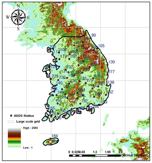 As shown in Figure 1, South Korea was selected as the study area. The large-scale reanalysis data were downscaled to the scale of the ground weather stations. The grid of reanalysis consisted of the 1.25° grids used by the Korea Meteorological Association (KMA) for global simulation, and 59 automated synoptic weather system (ASOS) stations were utilized as ground observation points. Figure 1 shows the ASOS stations, grids of reanalysis, and elevation. The annual average precipitation of the ASOS is approximately 1400 mm. The 18 grids cover most of South Korea.