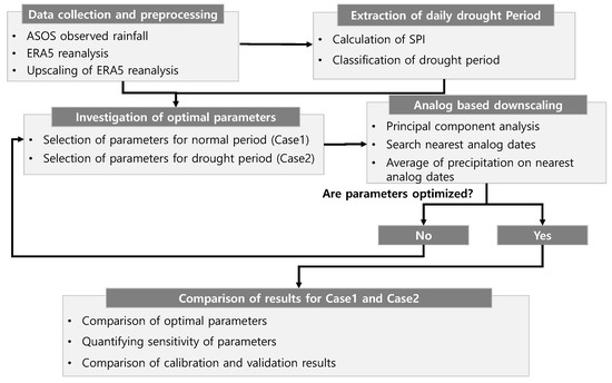 Figure 2 shows the methodological framework of this study. After collecting the data, daily drought periods were extracted by using the daily standardized precipitation index (SPI). Based on these drought periods, optimal parameter sets corresponding to the normal period (Case 1) and drought period (Case 2) were searched. Case 1 included flood, normal, and drought periods, while Case 2 included only drought periods. The performances of the downscaling results were evaluated and compared case by case. Finally, it was possible to derive the optimal parameter set and assess its sensitivity regarding the downscaling of daily precipitation in South Korea and to elaborate added values in the downscaling method to optimize the method for the drought period. All of these processes were implemented with MATLAB codes written by the authors.