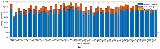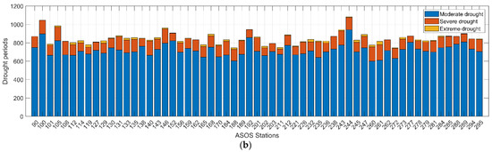 Figure 3 shows the results obtained by extracting the drought period from the ASOS station data. The drought period was extracted, and the severity values were classified based on the previously established drought classification criteria of the SPI by Mckee [43]. At most stations, approximately 14–17% of the analyzed period could be classified as reflecting drought conditions. This is an appropriate drought period proportion considering the SPI characteristics, as the SPI is calculated based on a standard Gaussian distribution.