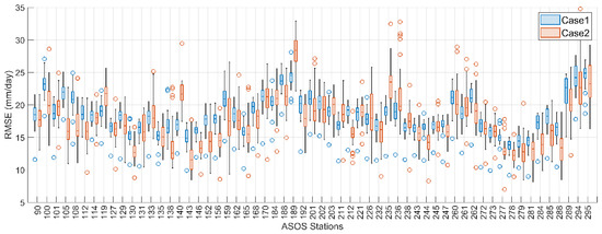 By case, Case 1 and Case 2 had 41 stations for which different predictor variables were selected, composing approximately 70% of the total number of stations. To examine whether the optimal predictor set derived in Case 2 had added value compared to that in Case 1, the RMSEs obtained for Case 1 and Case 2 were compared during the drought period. Among the 41 stations where different predictors were selected between Case 1 and Case 2, the average RMSEs obtained for Case 2 were 10.5% smaller than the corresponding Case 1 RMSEs at 35 stations. Therefore, selecting drought period predictors can effectively improve the downscaled precipitation accuracy during a drought period. However, the lack of improvement at six stations was thought to be caused by the limitations of the stepwise method, as this method cannot consider all possible predictor combinations.