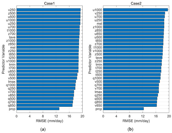 Figure 5 shows a comparison of the downscaling performance obtained for Case 1 and Case 2 using a single predictor. Each bar chart indicates the RMSE between the downscaling result and the observation based on each individual predictor. The results of both Case 1 and Case 2 showed that the maximum RMSE was approximately double the minimum RMSE. In other words, the predictor selection process was highly sensitive to the downscaling performance. In the Case 1 results, prcp showed the best performance for all stations. Additionally, v850, a circulation variable, and the humidity variables q850, q700, and q500 all showed high performances. The high-pressure-level variables showed lower RMSEs than the low-pressure-level variables. In Case 1 and Case 2, the top 10 predictors included similar variables, although their orders differed. In both cases, except for tmax, the performances of the thermal variables were low, while the performances of the humidity and circulation variables were comparatively high.