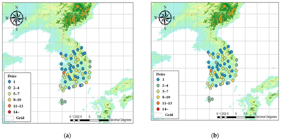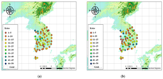 Figure 7 indicates the optimal K size for the ASOS stations. Each optimal K size was selected as the value that resulted in the best downscaling performance as K was increased from 1 to 41 by 2. The average optimal K obtained in Case 1 was 13.38, and the optimal Ks of inland stations were larger than the optimal Ks at coastal stations. The optimal K sizes were mostly distributed between 5 and 13, and stations with relatively large K sizes were distributed in western South Korea. The optimal K value obtained in Case 2 was 12.3% larger than that derived in Case 1. Unlike Case 1, in which the optimal Ks were large only at inland stations, in Case 2, the optimal Ks were relatively large at most stations. Because it is difficult to find a small number of informative analog dates that are suitable for representing unusual drought conditions, it was likely that the optimal K values obtained in Case 2 would be larger than those of Case 1. As shown in Figure 7, the appropriate K value may differ between drought and normal periods. These results support the idea of this study that suitable parameters should be explored for drought periods when performing drought assessments.