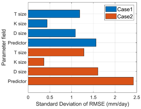 As a result of the sensitivity tests performed for Case 1, the predictor variable was found to be the most sensitive parameter in the downscaling process, with a standard deviation of 1.56. In addition, the T size, D size, and K size were sensitive to the downscaling performance. Because the T size was not an effective parameter for downscaling, it could be ignored in the sensitivity results. Comparing Case 1 and Case 2, the Case 2 parameter sensitivity levels were greater than the Case 1 sensitivities. The sensitivities of the predictor variable and D size in Case 2 were 55% and 47% higher than those in Case 1, respectively, and the sensitivity of the K size showed no significant difference between the two cases, suggesting that the parameter optimization process is more important when conducting spatial downscaling for drought periods than for normal periods.
