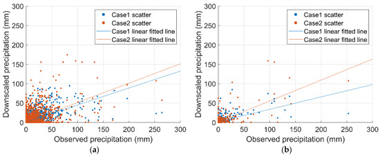 Figure 9 shows a scatter plot between the observation and downscaling results obtained during the calibration period of station 235. For both the normal and drought periods, the downscaling results were lower than the observations. The lower results were due to the bias of the ERA5 reanalysis. Since no bias correction function was contained in the PP downscaling process, the downscaling results were also lower. In most normal periods, the results of Case 1 and Case 2 were similar. However, the results of Case 2 were significantly different from the observations for a few days. In the drought period, the results of Case 2 were closer to the observations than the results of Case 1. Therefore, it was confirmed that Case 1 was relatively effective in the normal period and that Case 2 was effective in the drought period.