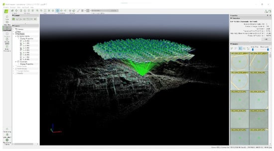 Pix4D Mapper implements topographic data by analyzing images captured in various areas based on the automated work sequence [,,]. For the analysis, up to 10,000 images can be processed, and the automated analysis technology improves accuracy by correcting any missing or inaccurate topographic information [,]. In addition, it enables analysis under the application of various cameras, such as standard perspective cameras and equidistant fisheye cameras [,].