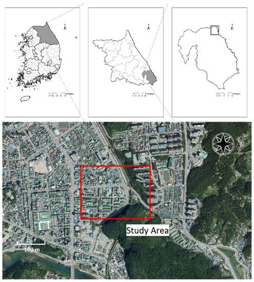 An urban area near the Samcheok public health center located in Samcheok City, Gangwon-do, Republic of Korea, where typhoon damages occurred in 2019 and 2020, was selected as the target area of this study, as shown in Figure 6. The target area has a high density of residential areas and commercial facilities. Therefore, massive damages are expected in the event of floods and heavy rainfall. The residential areas are located on the right side of the intersection of the Samcheok Public Health Center, and commercial areas are on the left side. In the residential areas, land use has changed from past mountainous areas to urban development. Moreover, most rainwater flows into the commercial areas when it rains due to the high altitude and an increase in impervious area in the residential areas. In the event of rainfall, flood damages occur near the Samcheok Public Health Center due to the inflow of rainwater into commercial areas.