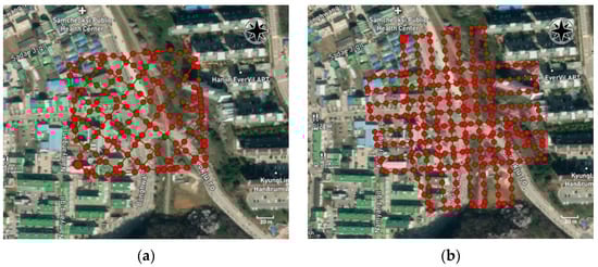 The overlap rate of photography must be determined once the photographing altitude and camera angle of the UAV are set. The overlap rate is the proportion of the overlapping area in each photograph, and it must be set to 70% or higher for precise photogrammetry. Because a high overlap rate is closely related to the UAV flight time, it must be planned considering the area and altitude of the target area. In this study, the overlap rate was set to 80% in both the longitudinal and transverse directions to construct the precise topographic data of the urban area. Based on the flight plan set for the target area, the photographing area was set to 0.222 km2, and the number of photographs was set to 179 and 336 for camera angles of 90° and 60°, respectively. Therefore, a total of 515 aerial photos were set, and the coordinates for UAV photography were set to WGS84. Table 3 lists the UAV flight plans in the target area.