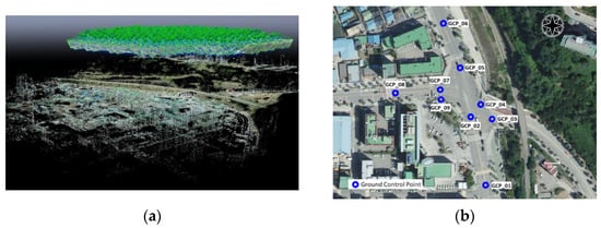 The aerial photos were captured using the UAV based on the flight plan set for the target area. The data including the real-time location information on the aerial photos taken using the UAV were acquired in connection with GNSS. The 515 aerial photos taken at different camera angles were subjected to image mapping using the Pix4D Mapper, as shown in Figure 8a. The topographic data were calibrated using GCPs after the initial processing for image mapping. In this study, nine GCPs were measured by considering the topographic characteristics of the target area, as shown in Figure 8b.