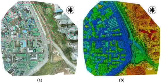 Moreover, the aerial photos and each GCP were matched after the initial processing of the acquired aerial photos. The accuracy of the matching increased as more photos were used. At least four photos must be matched to obtain highly precise results. In this study, ten aerial photos were matched for each GCP. The calibrated topographic data form a point cloud and mesh to analyze the orthomosaic and DSM. The analysis results for the target area are shown in Figure 9.