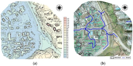 Watershed analysis using topographic data of UAV. (a) Contour; (b) watershed.